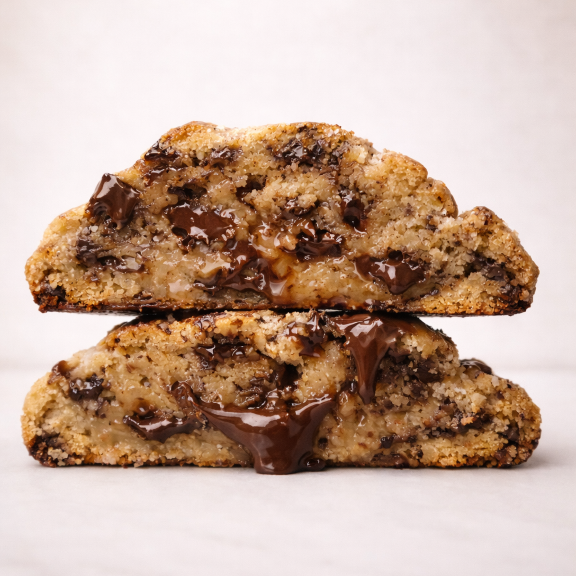 Un cookie moelleux aux pépites de chocolat, au cœur presque cru. L’original, tout simplement.